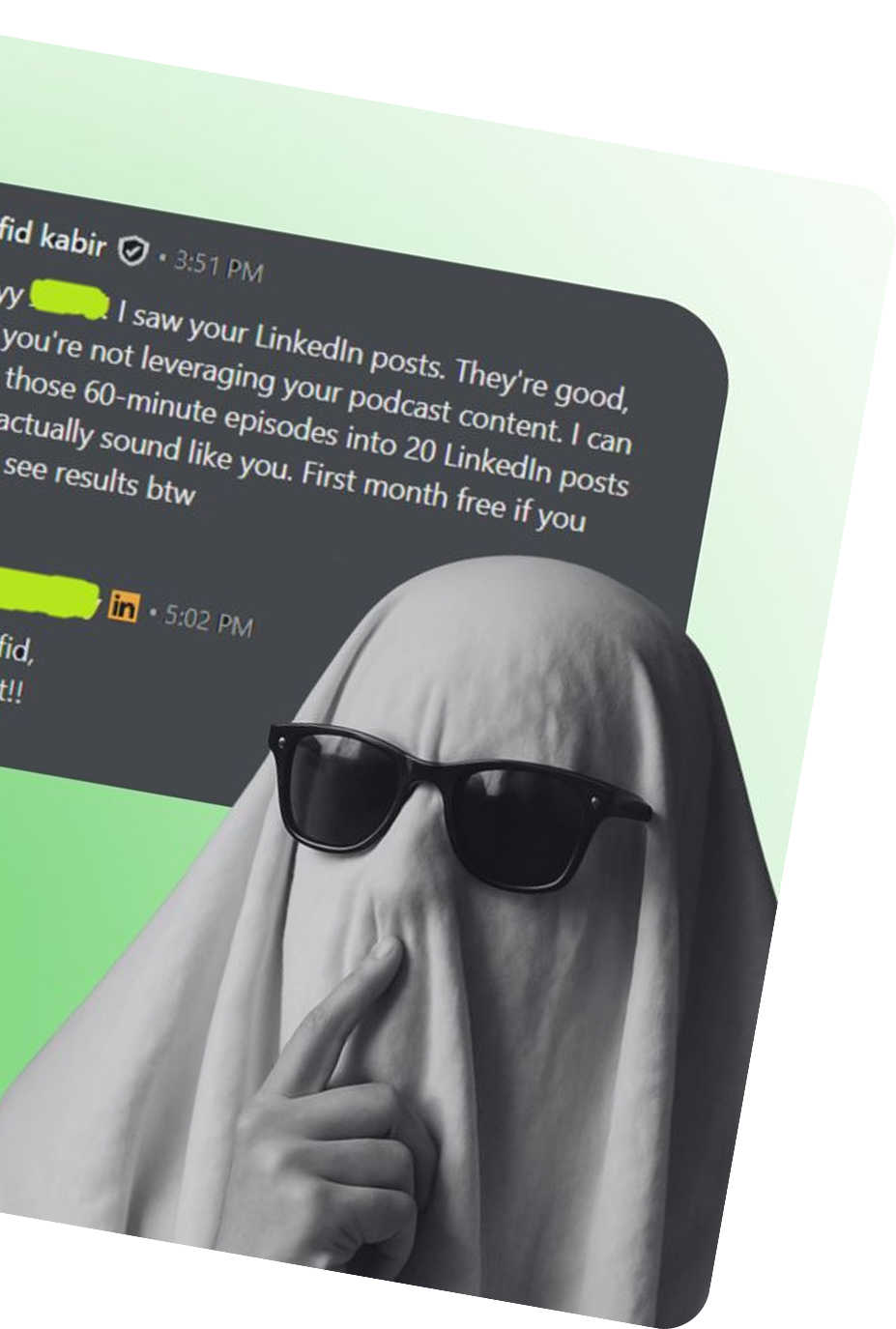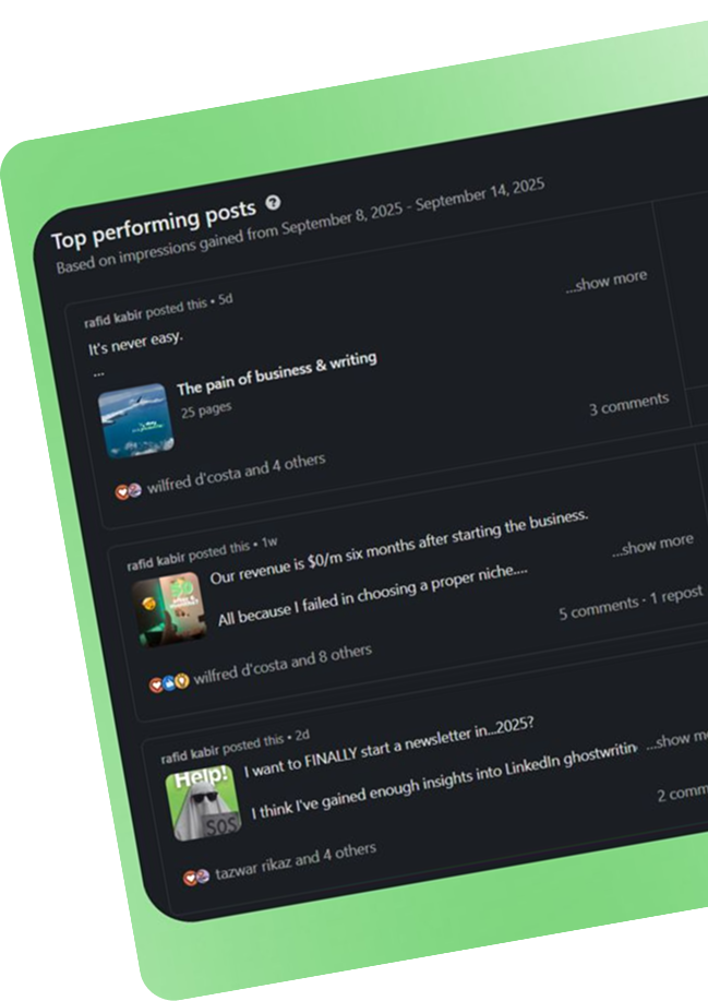 We create 4–5 LinkedIn posts weekly from your voice notes, calls and podcasts, plus handle engagement on your behalf to build brand authority.